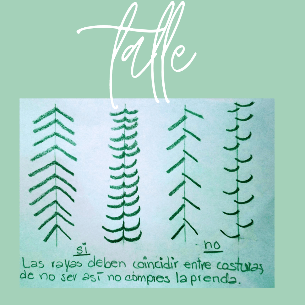 Confección: Busca que esté bien cocido, con punta menuda, si calzan bien las rayas o cuadros o cualquier estampado. Que los bolsillos, cuellos, puños, etcétera. En pocas palabras fíjate que las costuras calcen y estén bien cocidos.