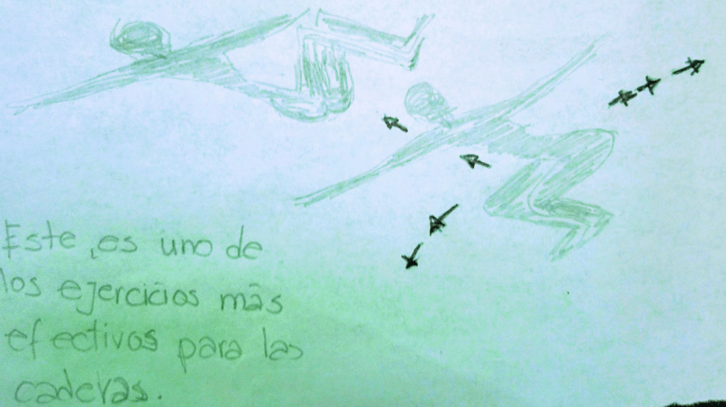 Una vez realizada la cadera derecha vamos a realizar la cadera de la izquierda los movimientos son hacia arriba y hacia abajo, hacia adelante y hacia atrás, recuerda mantener la cadera hacia afuera. Repetir los movimientos de ambos lados por lo menos unas seis veces.