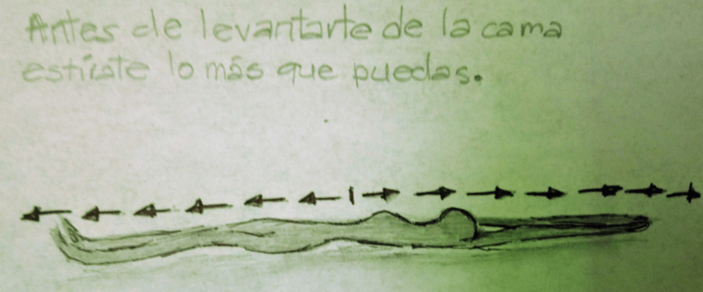 1.- Actúa como si fueras una cinta elástica, en cuanto te despiertes y aún acostada en la cama empieza a realizar estiramientos hacia arriba y hacia abajo. A lo largo del costado derecho y posteriormente al costado izquierdo estira los músculos de los hombros y caderas.