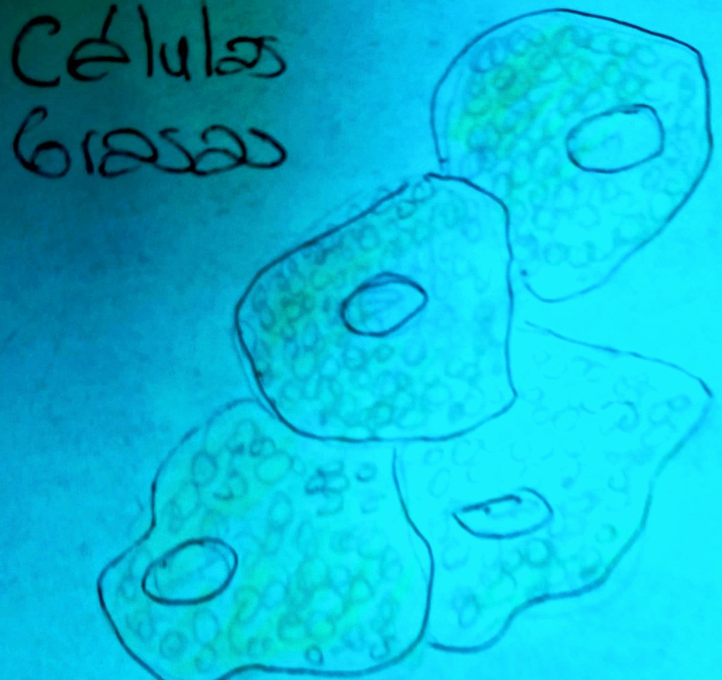 La grasa que no es utilizada al instante se almacena en las células, si tuviéramos la oportunidad de observar una célula grasa por el microscopio, se vería un grupo normal de núcleo, mitocondria, así como muchas cosas más, pero sin duda estaría cubierto por una gran gota grasosa que conforma alrededor del 85% de su volumen.