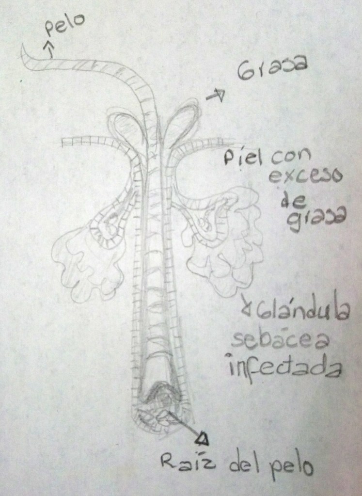 En el momento en que esas glándulas sebáceas se enferman, producen en su interior una cantidad excesiva de grasa, y por consiguiente, una formación de materia infecciosa en los poros de la piel. En ese instante aparecen protuberancia infecciosas que van desde leves a muy graves, las cuales se llaman acné.